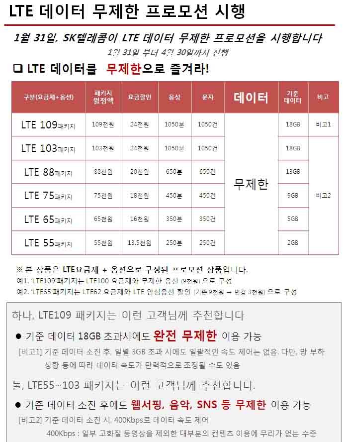 - LTE109 : LTE100¿ä±ÝÁ¦ °¡ÀÔ ÈÄ LTE¹«Á¦ÇѿɼÇ(1/31Ãâ½Ã¿¹Á¤) Ãß°¡ °¡ÀÔ Ã³¸®