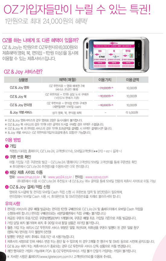 OZ °¡ÀÔÀڵ鸸ÀÌ ´©¸± ¼ö Àִ Ư±Ç~! - 1¸¸¿øÀ¸·Î 24,000¿øÀÇ ÇýÅà - OZ & Joy´Â 1¸¸¿øÀ¸·Î OZ¹«ÇÑÀÚÀ¯(6,000¿ø)¿Í Á¦ÈÞÇýÅÃ(¿µÈ­,ºÏ,ÆíÀÇÁ¡ - 1¸¸¿ø ÀÌ»ó)À» µ¿½Ã¿¡ ÀÌ¿ëÇÒ ¼ö ÀÖ´Â Á¦ÈÞ¼­ºñ½ºÀÔ´Ï´Ù.