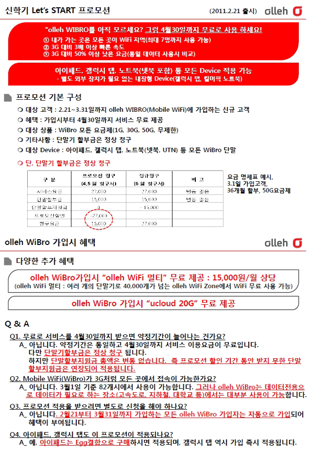 ¡Ý ´ë»ó°í°´ : 2011.02.21 ~ 3.31ÀϱîÁö olleh WiBro¿¡ °¡ÀÔÇÏ´Â °í°´
